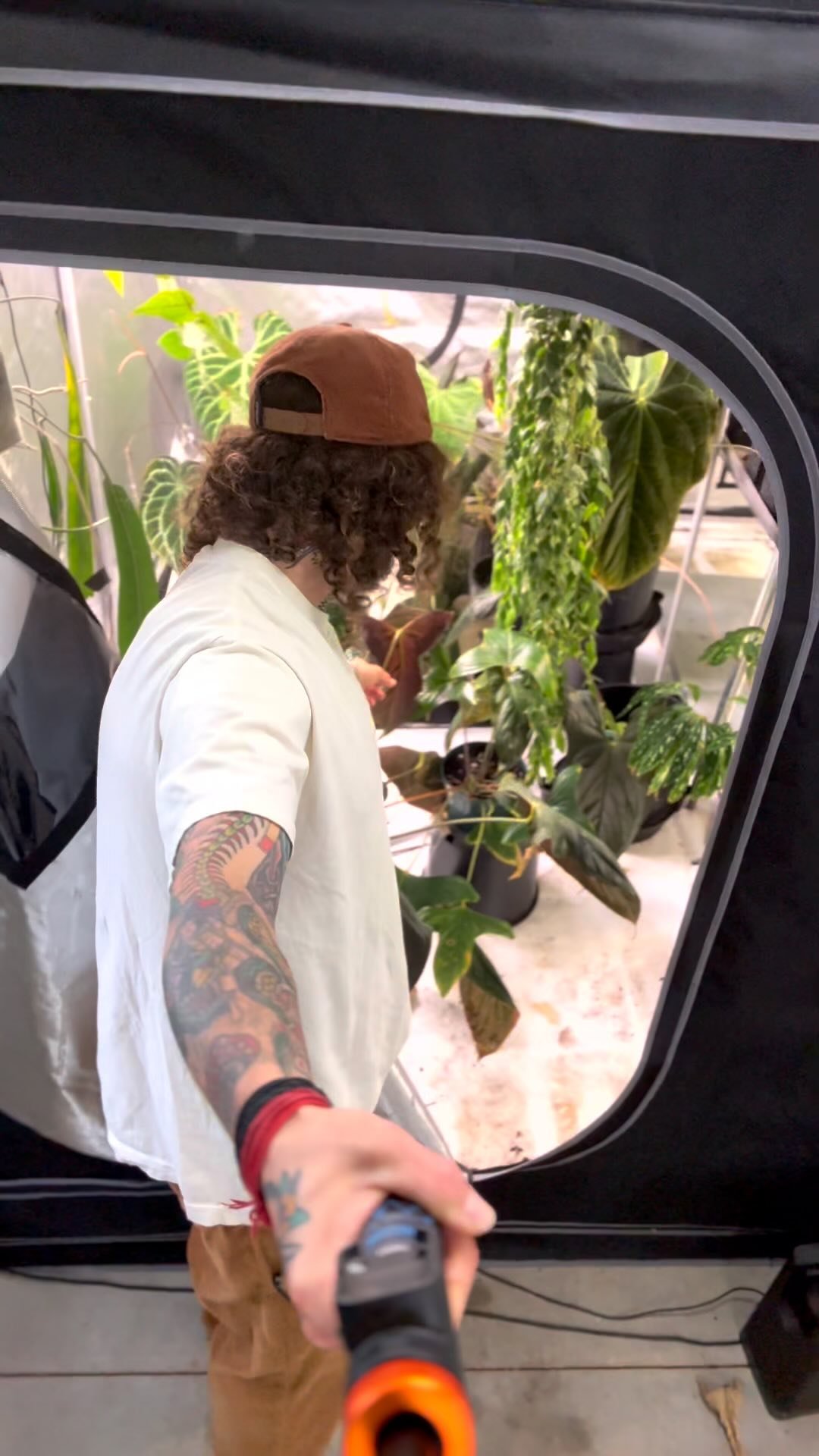 Me with Anthurium carlablackiae and an unnamed species traded as “Anthurium BVEP” outside one of our grow tents here in North Carolina.